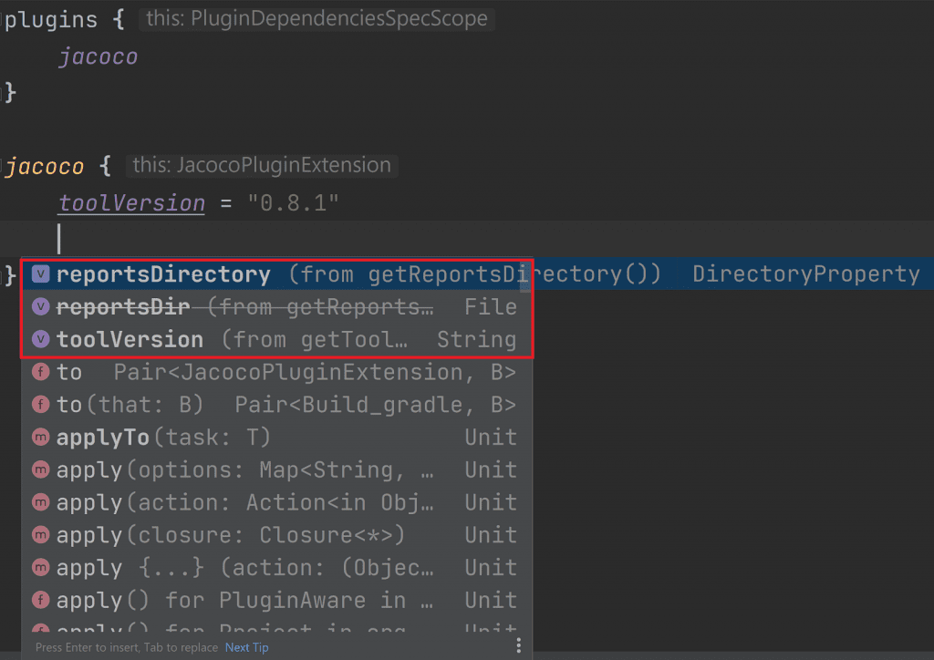 }The Gradle Kotlin DSL has simplified syntax via property extensions for the built in plugins.