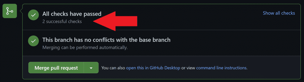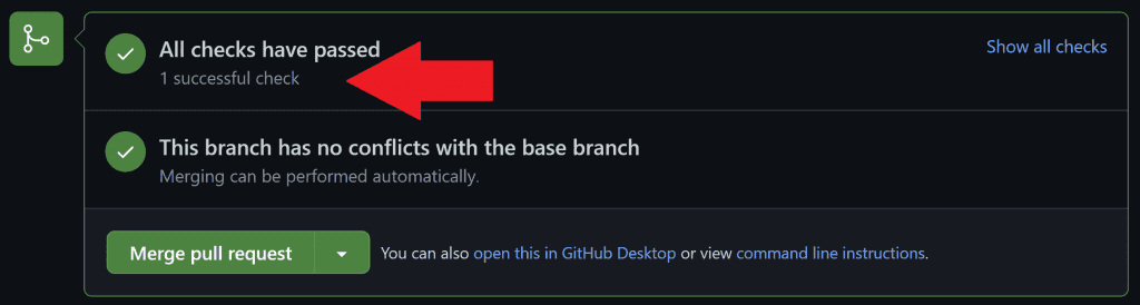 Once the workflow passes, everything will be marked as green, including the Merge pull request button.