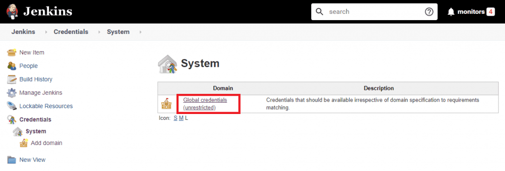 Let's add our Docker Hub credentials into Jenkins, by navigating through the somewhat long-winded following series of pages...