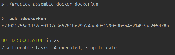 Now let's run ./gradlew assemble docker dockerRun to run a container from our image: