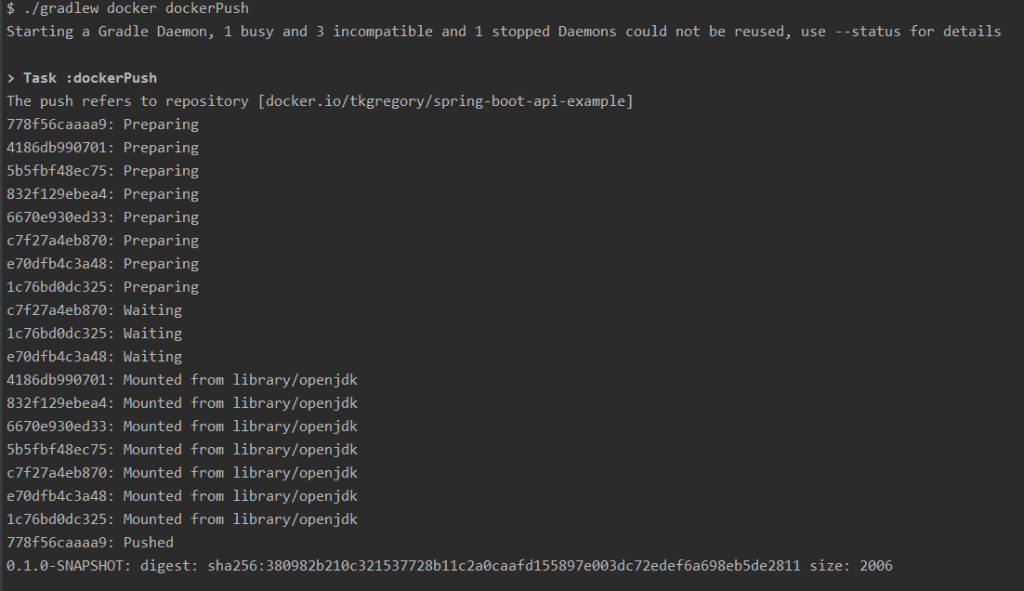 docker logincommand, and once we're logged in we can push the image to Docker Hub using thedockerPushGradle command.