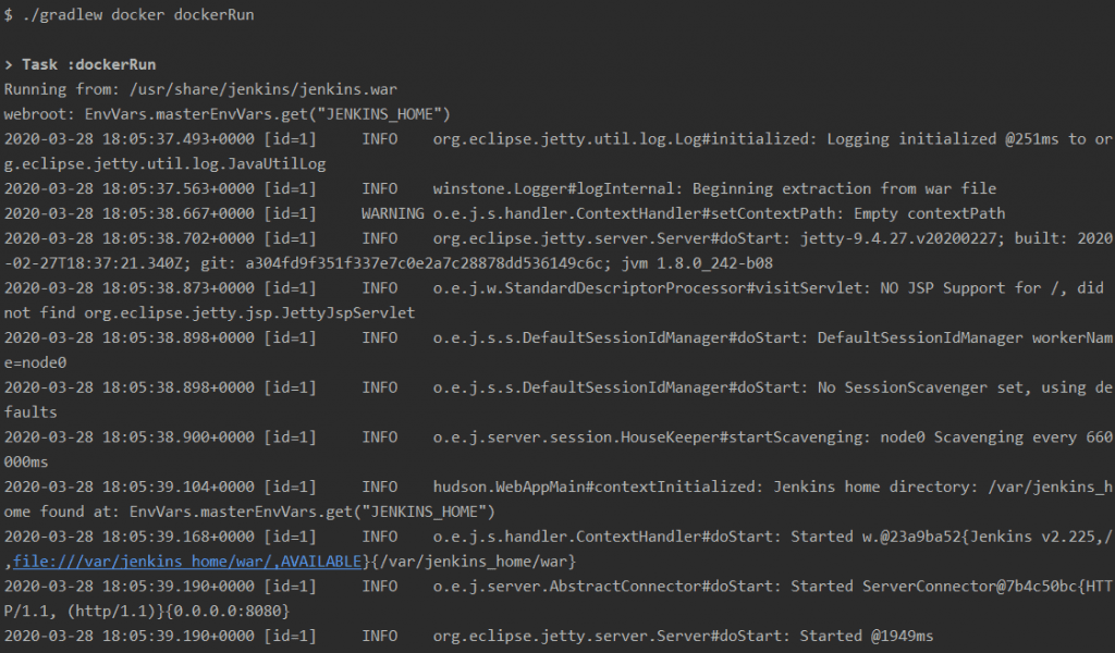 Now all we have to do is run ./gradlew docker dockerRun to start up Jenkins: