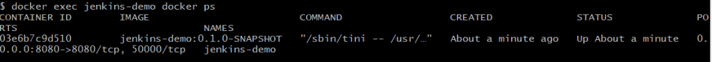 To double check that you can run Docker in Docker, run docker exec jenkins-demo docker ps. If you see output like below, you're good to continue.