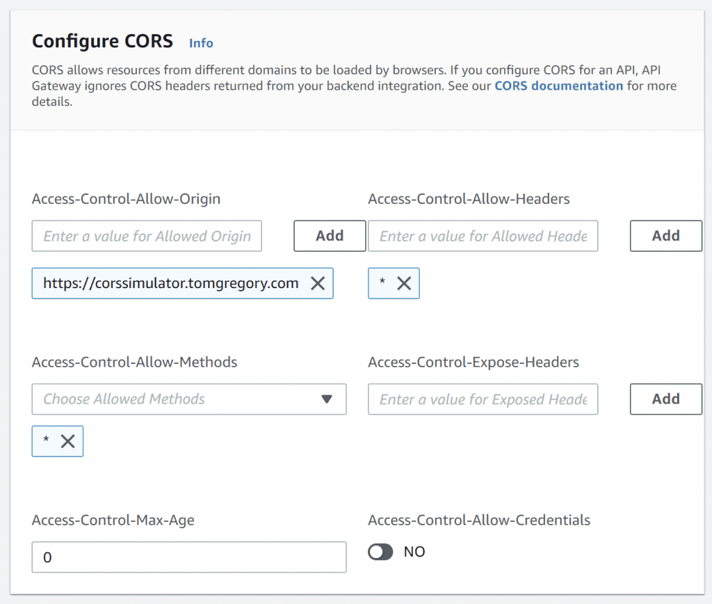 The benefit of using this approach is that once it's setup, additional API Gateway routes will automatically inherit this CORS configuration.