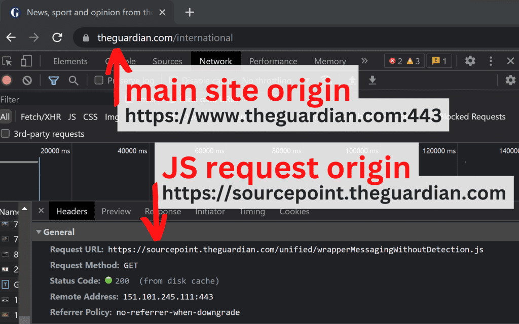 So the main https://www.theguardian.com:443/international document makes requests to other origins. We call these cross-origin requests.