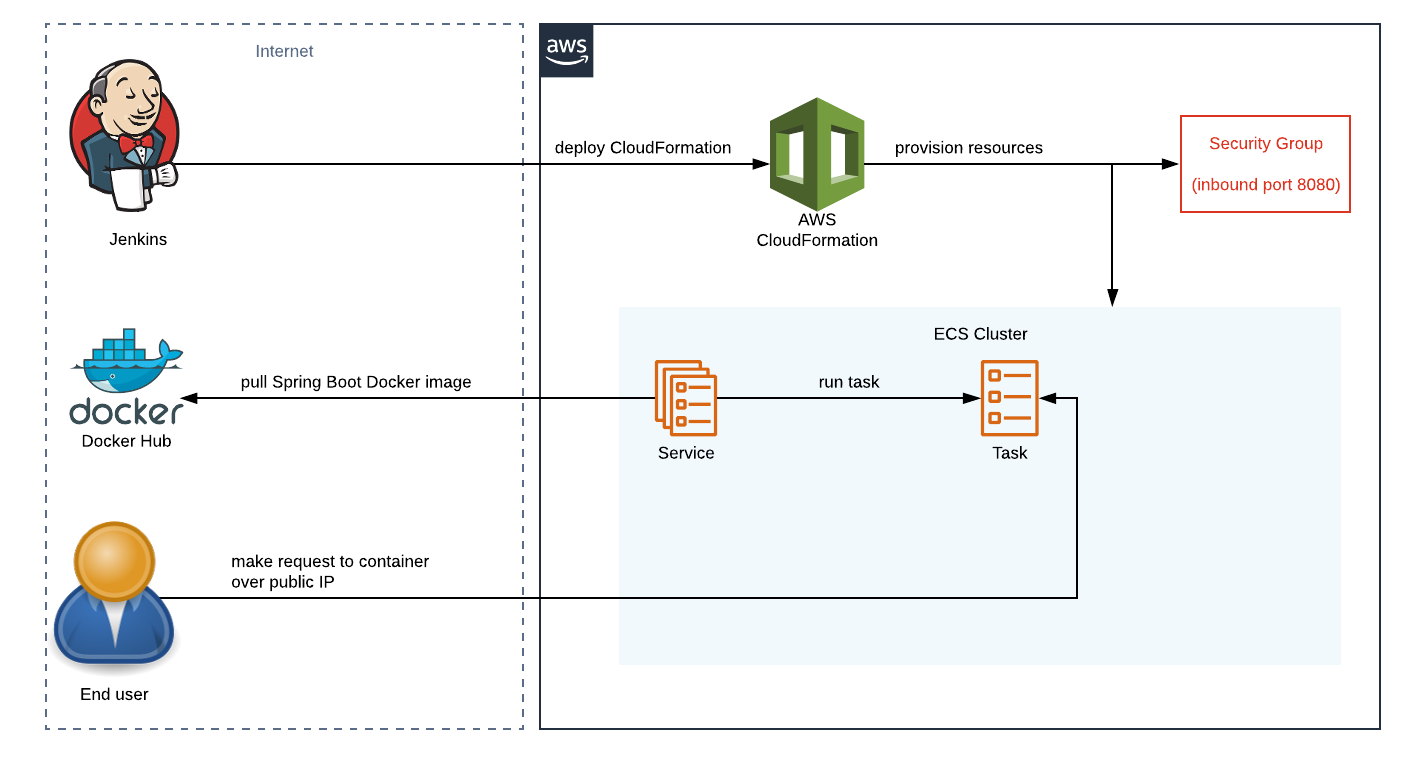 Jenkins will deploy a CloudFormation template into AWS. AWS will then go ahead and provision all the resources that we'll describe in our template, including: