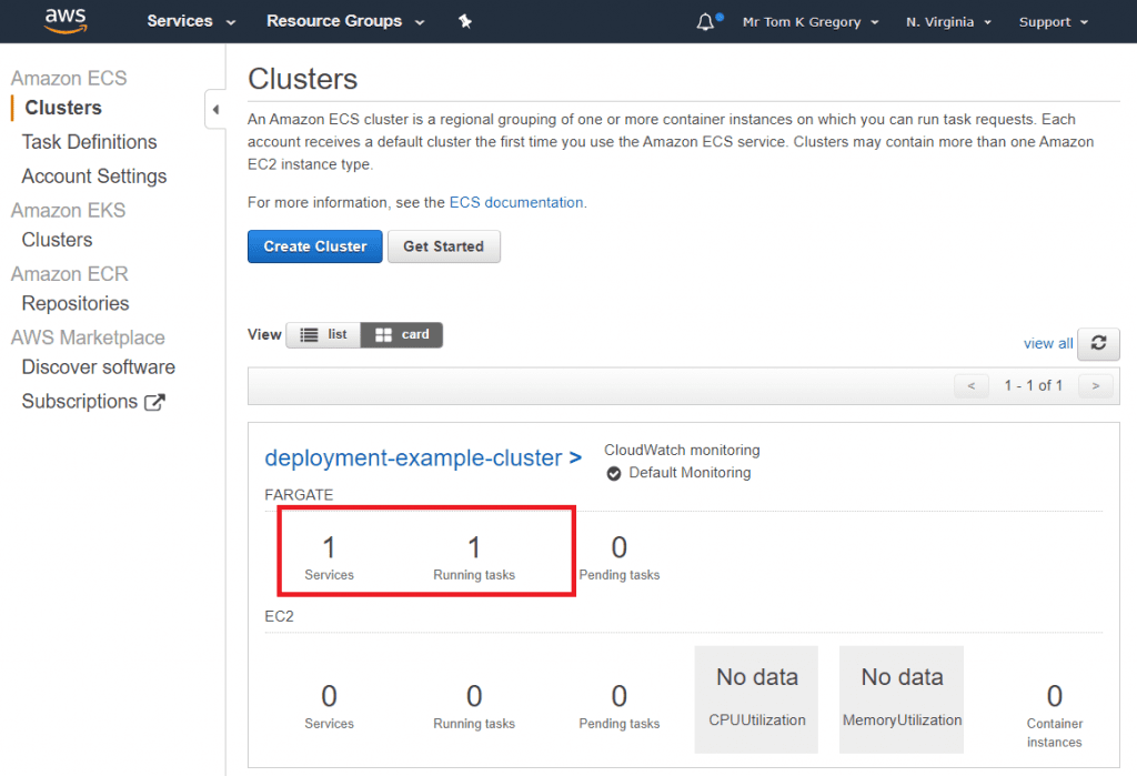 Go to Services > Elastic Container Service, and you'll see our ECS cluster deployment-example-cluster: