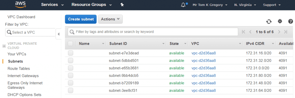 Once you have an account, you can use the default VPC and subnets that AWS creates for you in the rest of this example. Just go to Services > VPC, and select Subnets from the left-hand menu: