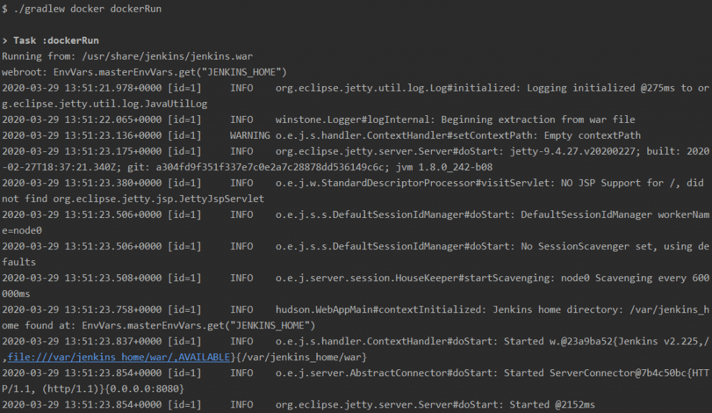 Start up Jenkins from the jenkins-demo project now by running ./gradlew docker dockerRun. This may take some time, but will build the new Docker image and then run the image as a Docker container: