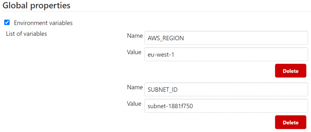Select Environment variables under Global properties, and click the Add button to add an environment variable. We need two variables, AWS_REGION and SUBNET_ID: