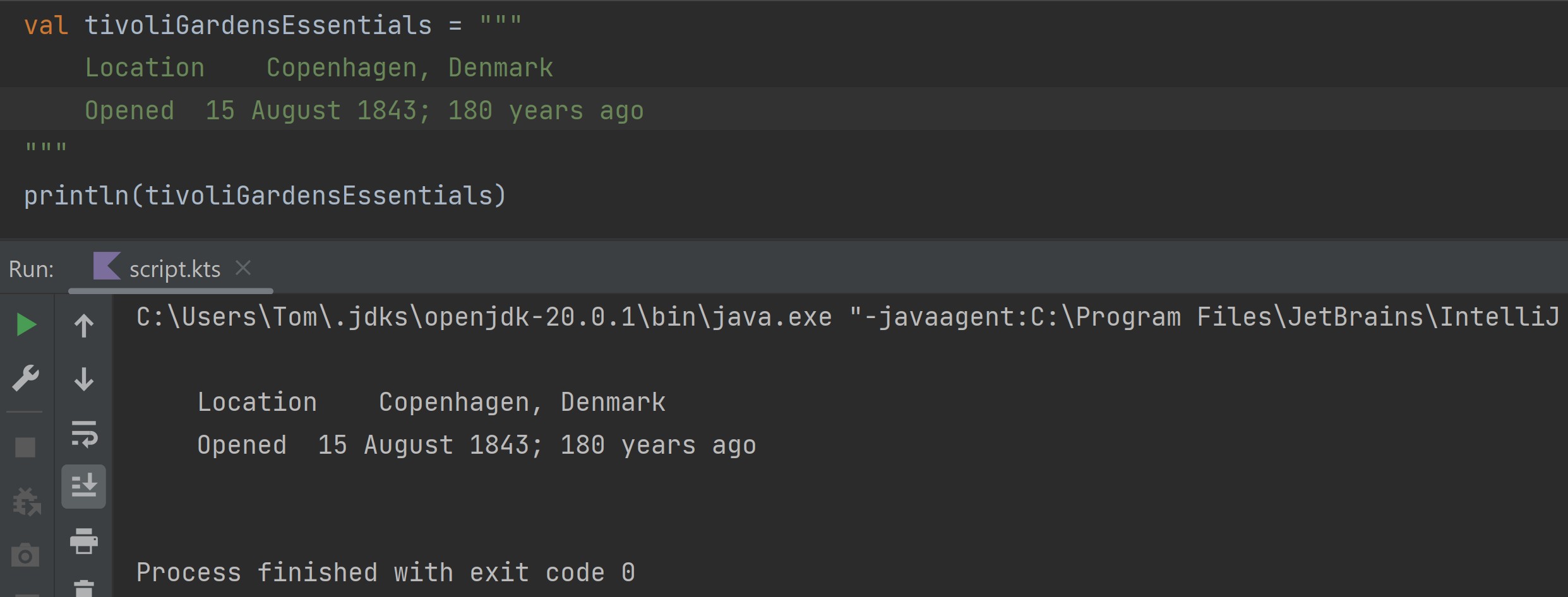 // prints Best ride at Tivoli Gardens is Star FlyerTriple quoted strings, like in Java, are an easy way to define a multi-line string without messing about with newline characters.