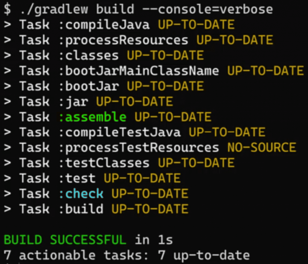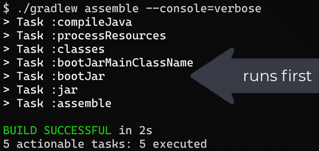 }Let's run assemble, and we see that Gradle runs bootJar first to generate the special Spring Boot fat jar file.