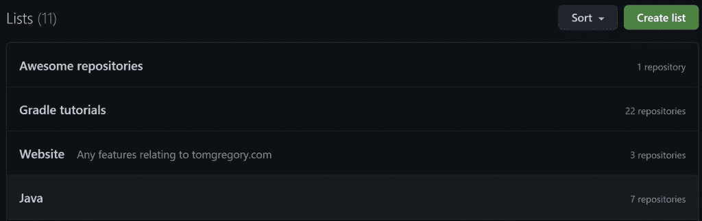 In my case, I have repositories for Gradle tutorials, Gradle plugins, my website, and so on. I want to view repositories by category, not as a single, seemingly endless list.