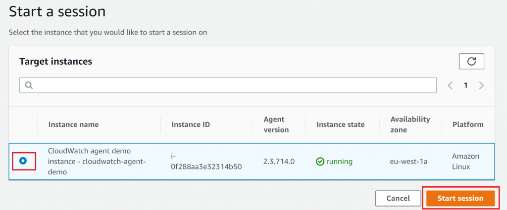 Select the CloudWatch agent demo instance, then click Start session. If your instance doesn't appear here, you may have to wait a few minutes: