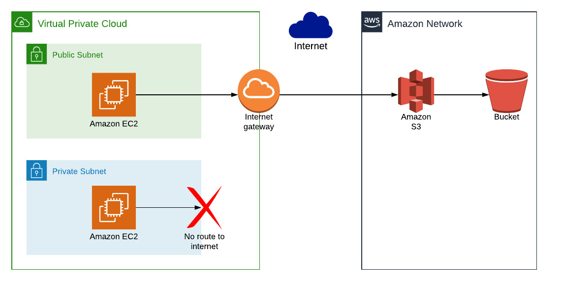 Where this starts to fall down, though, is when we need to access S3 from an EC2 instance in a private subnet, as in the example below: