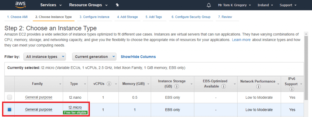 Go to Services > EC2 and click the Launch instance button. Select an Amazon Machine Image (AMI) to use, such as Amazon Linux 2 AMI (HVM), SSD Volume Type, then click Select.